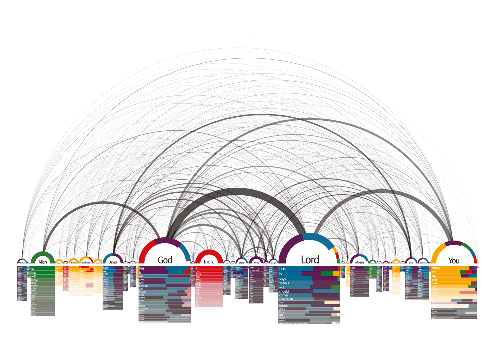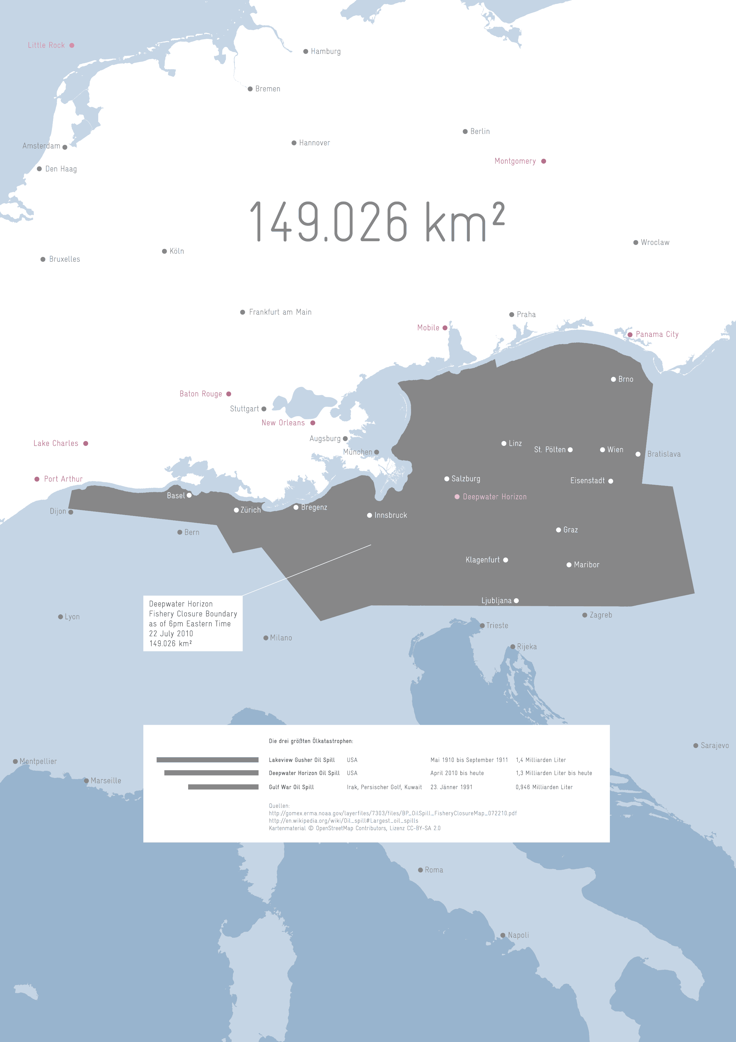 One of my interests is making data tangible through visualisation and interaction. The infographic 149.026 km2 (2010) shows the extent of the oil leakage of BP's Deepwater Horizon. In my BA studies I created the data visualisation Similar Diversity (2010) in the class of Stefan Sagmeister. It visualises the text of the holy books of the five world religions.
